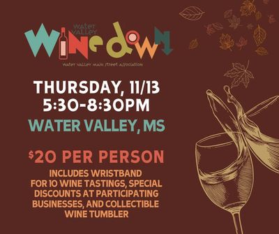It’s time to toast to the return of the Fall Wine Down on Water Valley's Main Street! Join us for an evening of wine tasting, local shopping, and community fun. Thursday, November 13th from 5:30-8:30 pm.